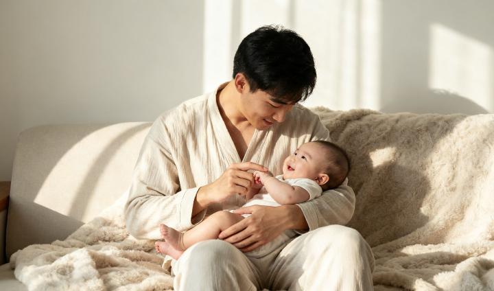 嬰兒喜歡柔軟舒適的依偎、舒服的肌膚接觸,鼓勵爸爸可以常常褓抱寶寶,溫柔、愉悅的碰觸與溫暖的撫慰,對寶寶的情感與社會發展很重要,是愛的投資,能夠帶給寶寶安全感與信任感。