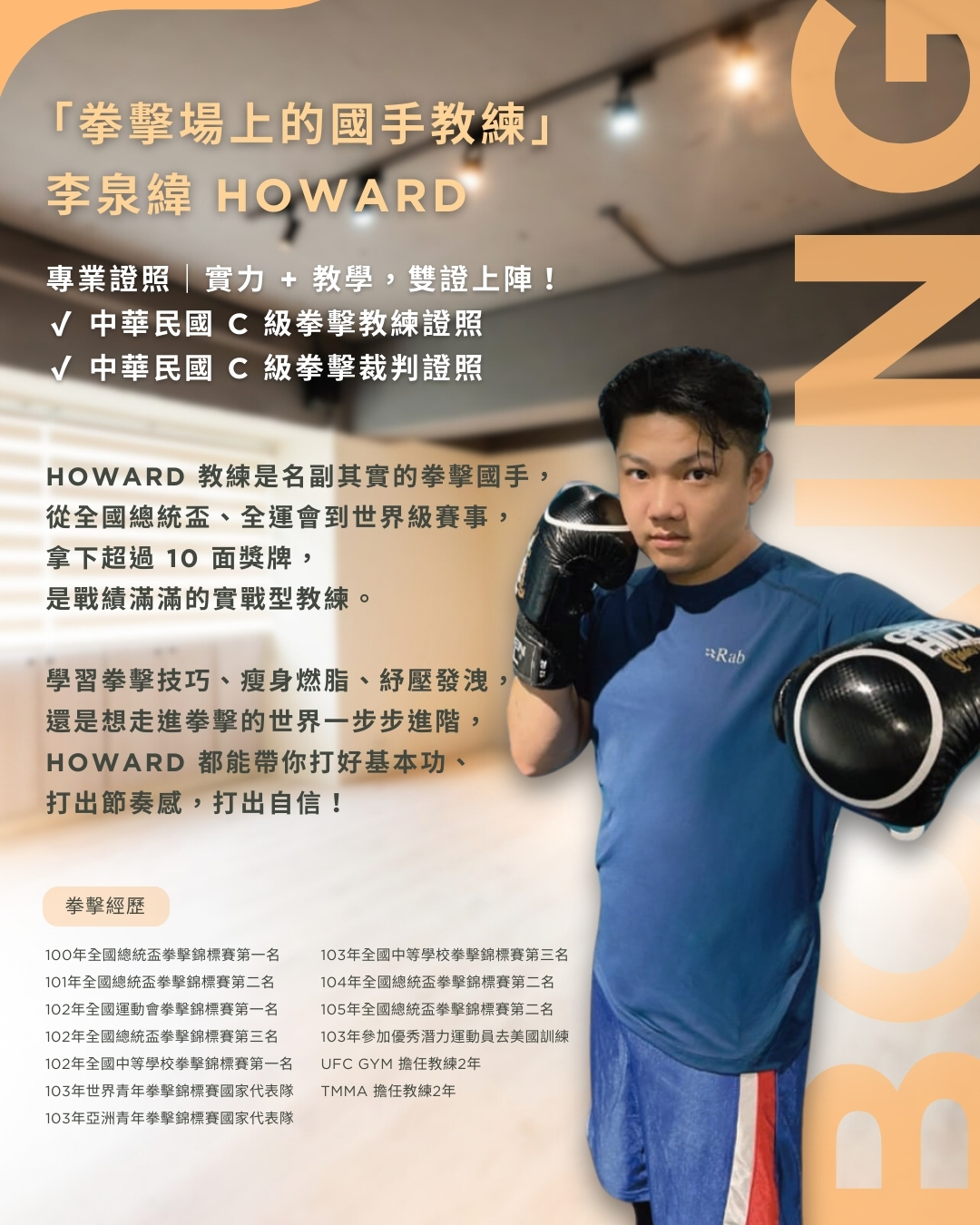 Howard 教練是名副其實的拳擊國手,從全國總統盃、全運會到世界級賽事,拿下超過10面獎牌,是戰績滿滿的實戰型教練。