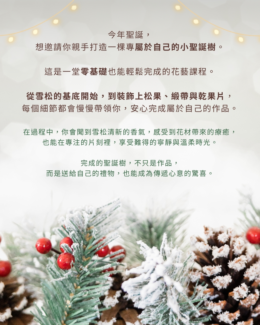 這是一堂 零基礎也能輕鬆完成 的花藝課程。我會一步一步陪著你,從雪松的基底開始,到裝飾上松果、緞帶與乾果片,每個細節都會慢慢引導,讓你安心完成屬於自己的作品。