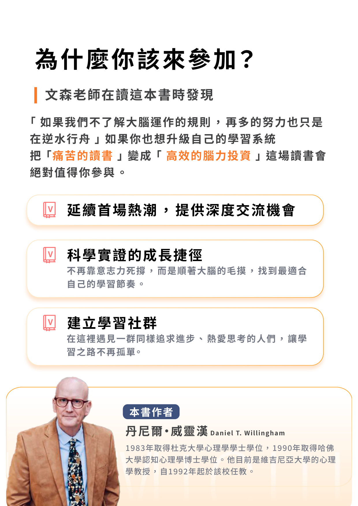 文森老師將拆解大腦運作的底層邏輯,分享他如何應用書中的理論,讓自己從「無效閱讀」轉化為「深度內化」,與大家分享如何將複雜的科學研究轉化為提升自我能力的具體行動。