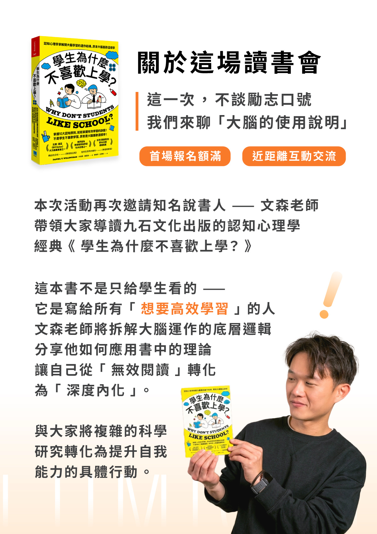 本次活動再次邀請知名說書人 文森老師,帶領大家導讀九石文化出版的認知心理學經典《學生為什麼不喜歡上學?》。 這本書不是只給學生看的,它是寫給所有「想要高效學習」的人。