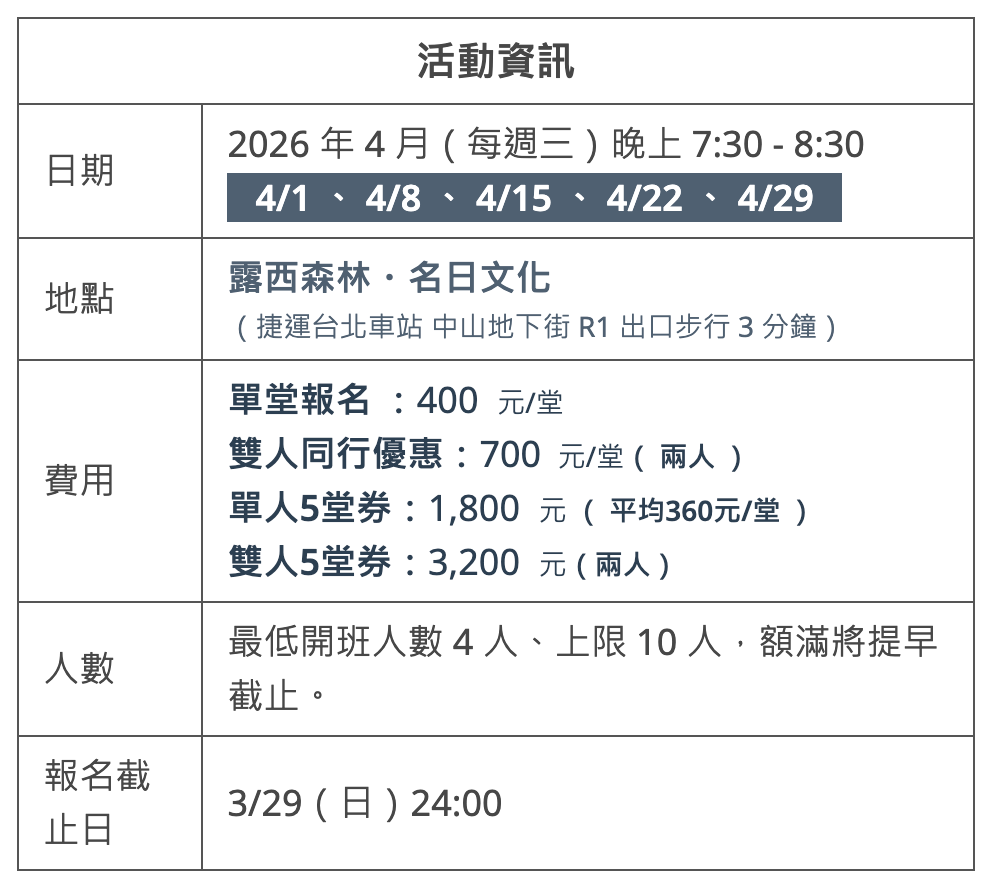 ▸▸ 提醒:活動期間有攝影師在旁側錄,記錄將保留做日後宣傳使用,報名即為同意,如介意入鏡,再煩請聯繫我們~謝謝