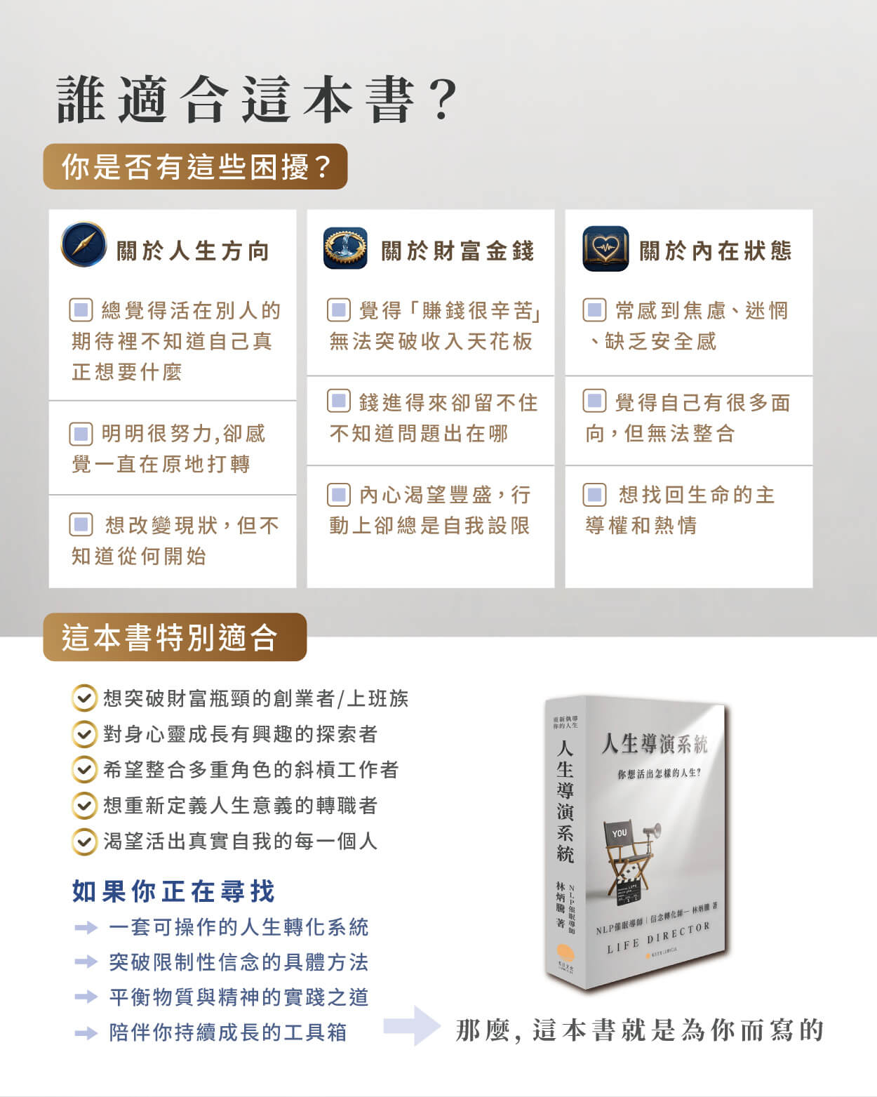 不只是心靈雞湯,而是可操作的「人生導演八部曲」: