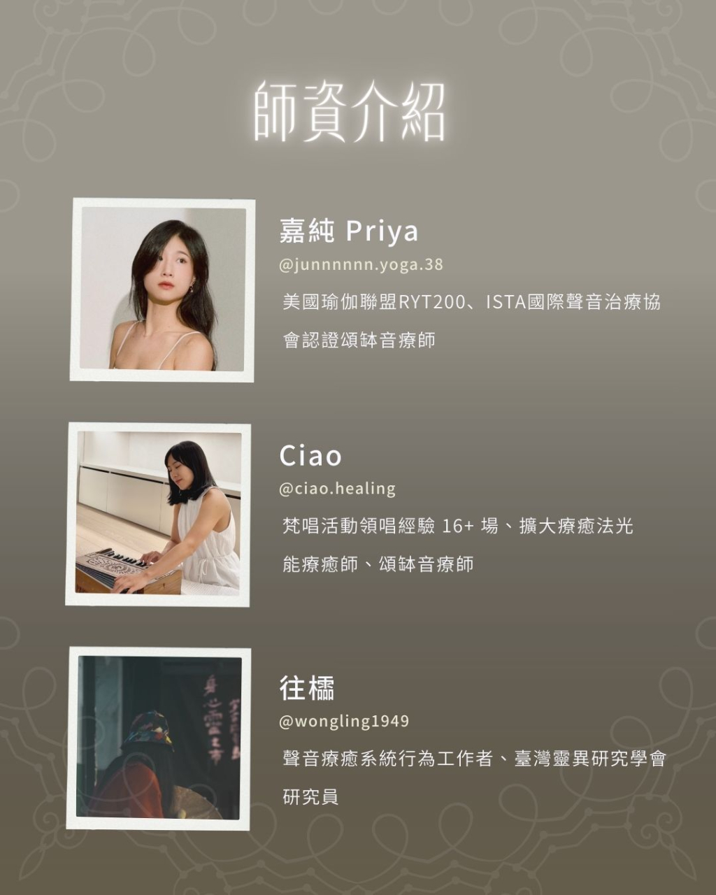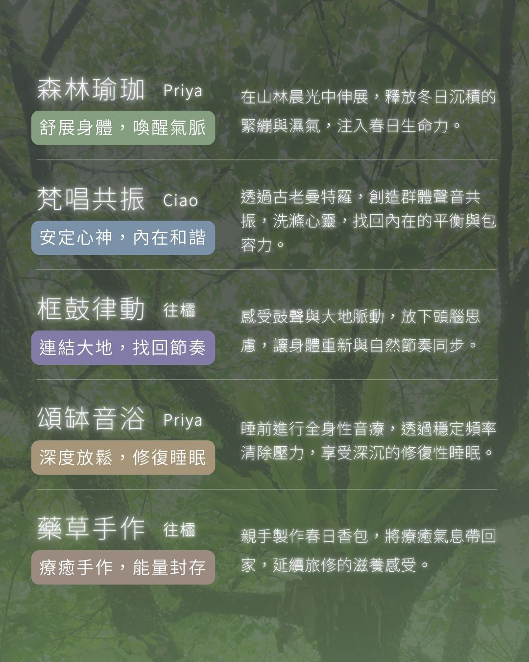 我們邀請您離開都市的喧囂,在坪林山林的靜謐中,透過三位專業療癒師的引導,平衡陰陽、釋放舊有,讓身體與心靈在春日中重新煥發生機。
