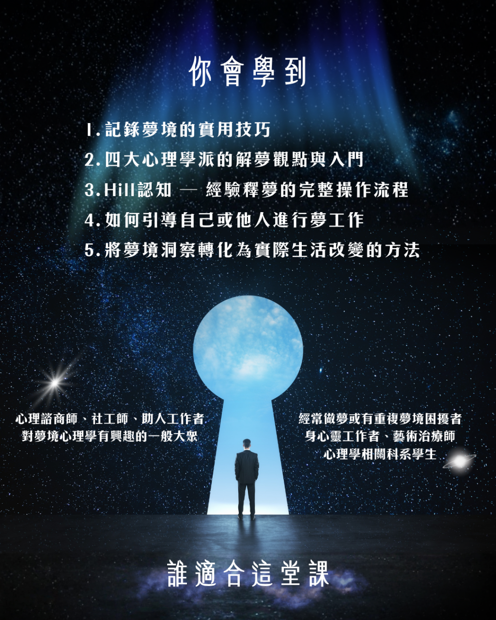 ➤ 心理諮商師、社工師、助人工作者 想增加夢工作專業技能 ➤ 對夢境心理學有興趣的一般大眾 渴望深入了解自己的內在世界 ➤ 經常做夢或有重複夢境困擾者 想透過夢境進行自我療癒 ➤ 身心靈工作者、藝術治療師 希望拓展工作取向與技術 ➤ 心理學相關科系學生 想深化夢境理論與實務應用