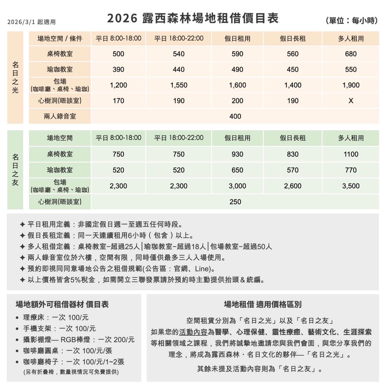即日起預約 2026/3/1(含)以後的場地租借將以新價格計算收費。