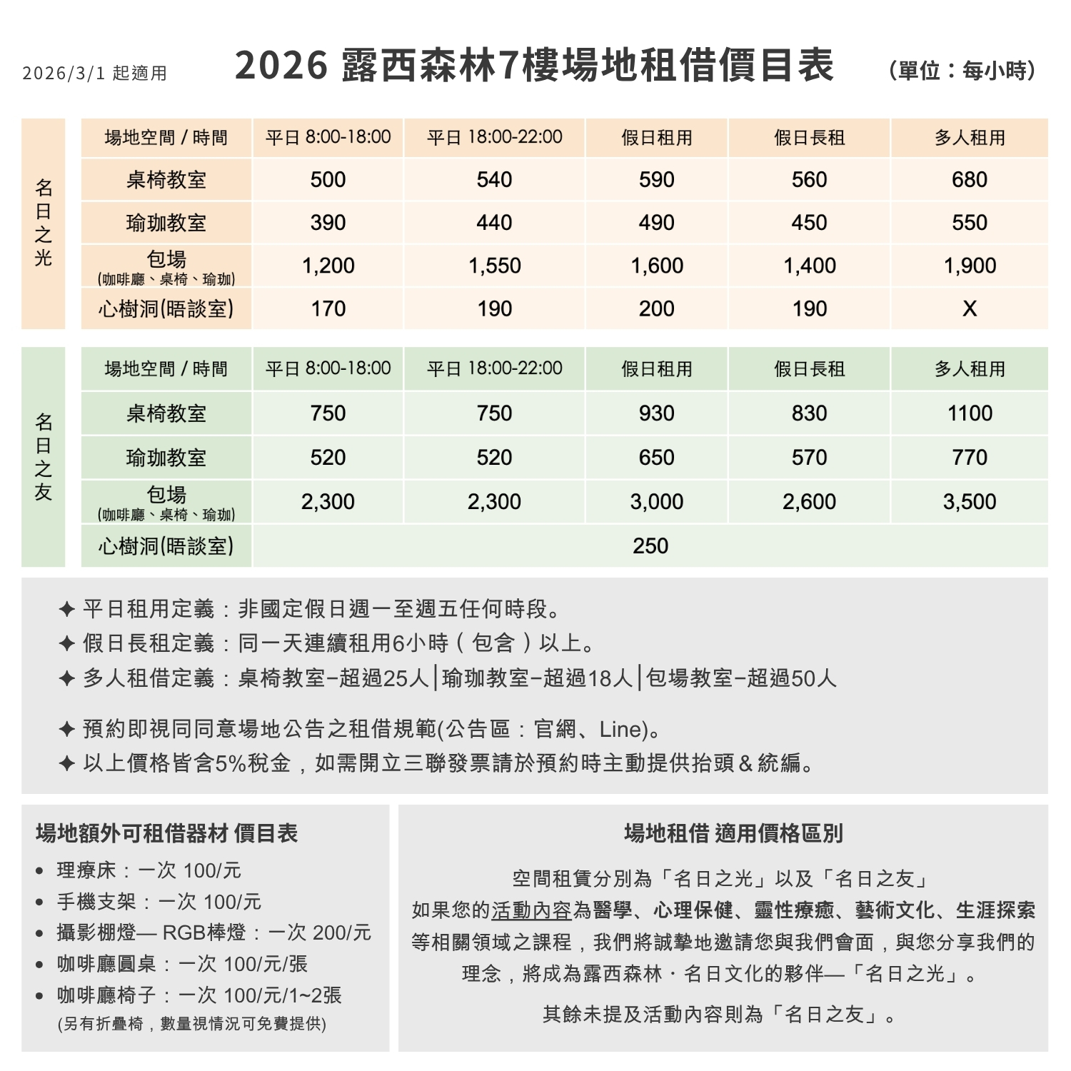 空間租賃分別為「名日之光」以及「名日之友」 如果您的活動內容為 精神醫學 、 靈性療癒 、 藝術文化 、 生涯探索 等相關領域之課程 我們將誠摯地邀請您與我們會面,與您分享我們的理念,病成為露西森林・名日文化的夥伴—「 名日之光 」。